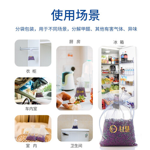 智能显色,吸附分解。除醛包除了物理吸附之外,还可以进行氧化分解,双重净化效果更佳。体积小巧轻便,车内、鞋柜等均可使用。