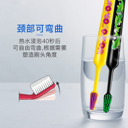 热水浸泡40秒后可自由弯曲,根据孩子口腔情况自由调整刷头角度,用起来更舒服。手柄凹槽设计,手感舒适,方便孩子握取。