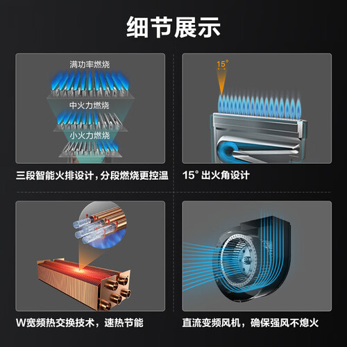这款热水器加入宽频热交换技术,受热均匀,加热速度快。采用15°出火角设计,避免火焰燃烧干扰,燃烧效率提升,安全环保。
