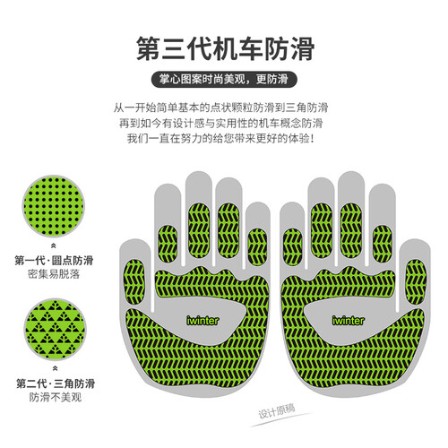 手套掌心采用经过改良的第三代机车防滑轮胎形状纹路,具有优越的防滑性能;内里材质采用加厚羊绒,手感厚实细腻,戴上保暖舒适。