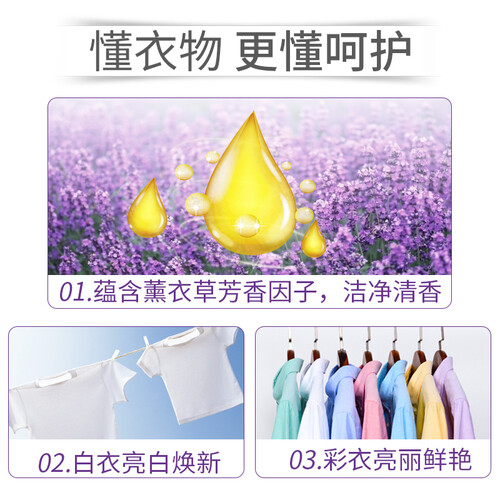 蕴含薰衣草芳香因子,淡淡的花香气息,非常的好闻,愉悦你的嗅觉,提升魅力。富含多种活性成分,深层去除污渍。