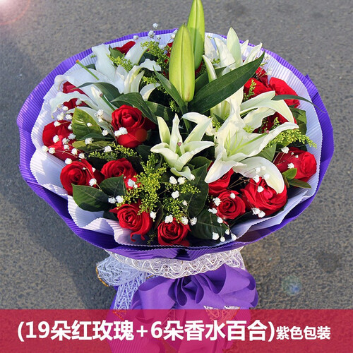 甄选优质花材,由温婉儒雅的香水百合搭配热情奔放的红玫瑰,并以黄莺草等作点缀,恰到好处,时尚不过时。