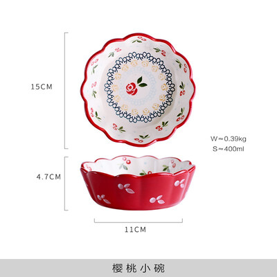 采用波浪形的碗边,配合樱桃甜美样式设计,更具可爱萌趣风格。水彩的釉色,着色牢固持久,底部不经过上釉,防滑性佳。
