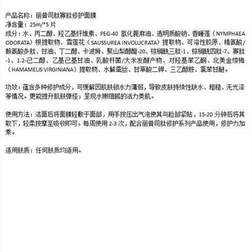 萃取植物精华,清爽不粘腻,有效改善干燥皮肤;多种营养成分,锁水保湿,亮白肌肤;采用进口纤维丝,质地柔软,贴服度更高。