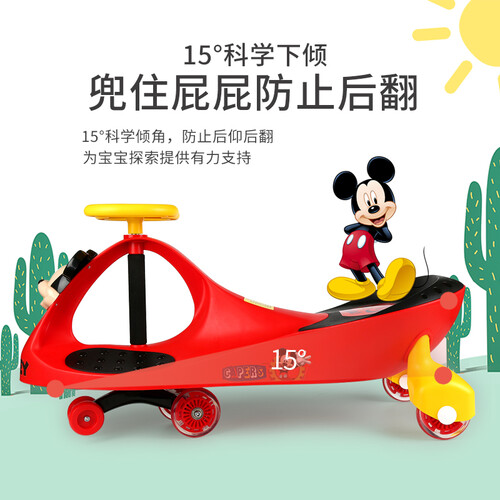 米奇造型的儿童扭扭车,很讨孩子喜爱。车身光滑流畅无毛刺,宝宝安全玩耍。蝶形方向盘设计,更容易掌控。