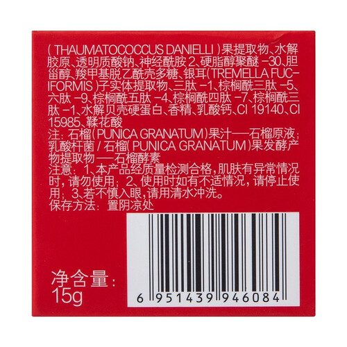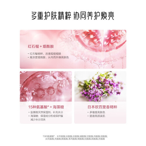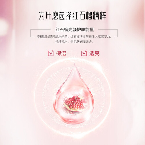 蕴含红石榴精粹、红石榴酵素,在让肌肤喝饱水的同时,更能焕发肌肤莹润感,并进一步改善黯淡肌肤。
