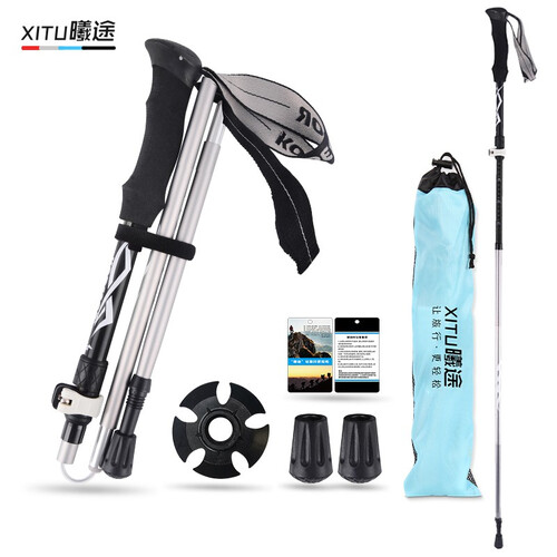 轻量化杖杆设计,四节易折叠结构,魔术贴收纳,也可快速弹开锁扣,变成完整登山杖模样。手柄末端有轻柔腕带,方便日常携带。