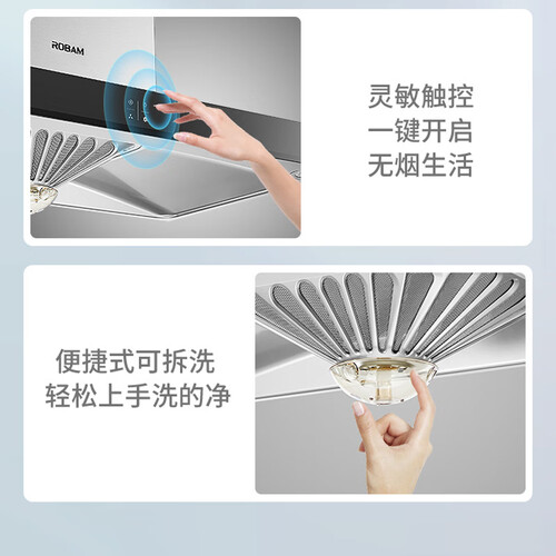 具有黑镜面板的设计,表面光滑平整,不易粘黏油污,一擦即净,清洁更轻松。360Pa强劲风压,避免油烟倒灌。
