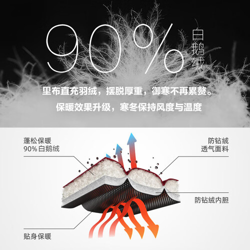 甄选纤维柔长蓬松的白鹅绒填充,帮助阻隔冷空气进入,身体蓄热锁暖抵御严寒。结合直充绒工艺,帮助摆脱厚重感,轻盈穿着,防寒性能出色。