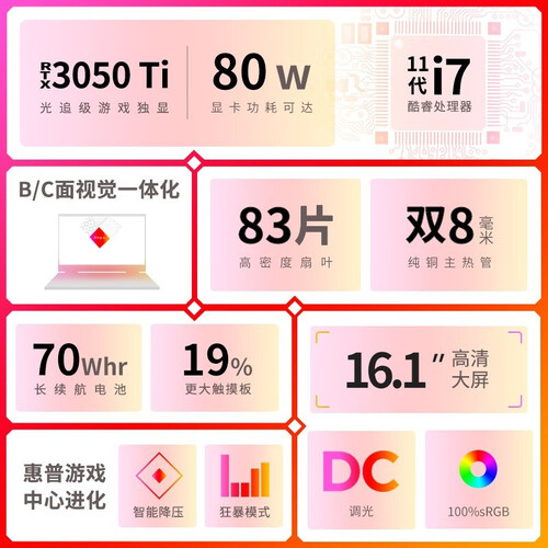 83片高密度扇叶,双8mm主热管,风量更大,快速带走热量,保持高速运行。70W大容量电池,长效续航,不为电量焦虑。