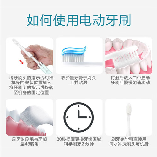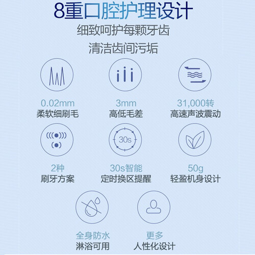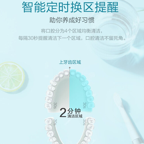 采用高速声波震动,细腻冲刷口腔死角,去除牙缝间与牙龈周围的顽固牙渍,两档刷牙模式,满足不同口腔清洁需求。