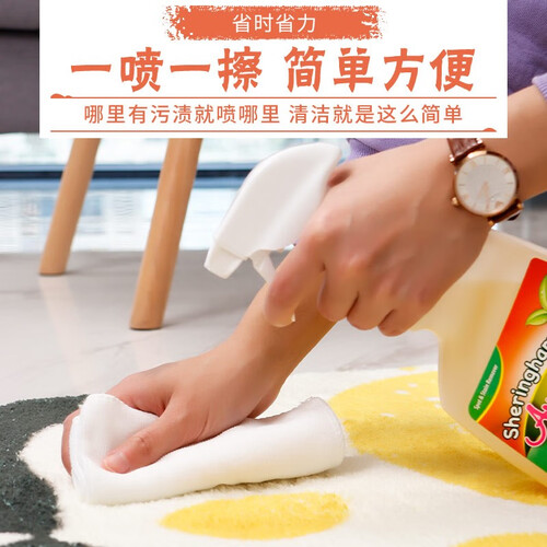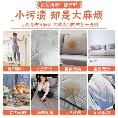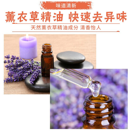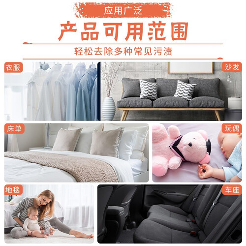 无需水洗,不用拆下来清洗,轻轻一喷即可去除各种顽固污渍;添加薰衣草精油,散发植物芳香,去污的同时去除异味。