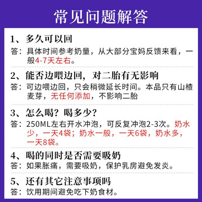 这款回乃茶,有利于缓解胸部胀痛,宝宝断奶时可饮用,回奶效果好。独立小茶包设计,干净卫生,方便携带冲泡。