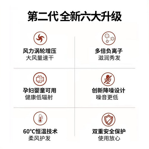 含高浓度水润负离子,可以呵护头发健康,深入滋养秀发,加入远红外线科技,让出风均匀有力,秀发得到焕然新生。