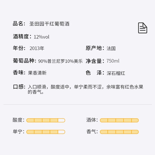 采用法国普兰尼罗和美乐葡萄混酿而成,葡萄口感饱满,富有果香。采用天然酿造方法,保留丰富的营养元素,口感微甜,单宁柔和。