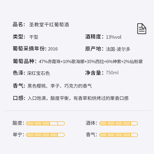 采用赤霞珠和、仙粉黛等多种的葡萄混酿而成,结构突出,单宁丰满,口感丰富。酒体呈深红宝石色,清澈透亮,散发淡淡巧克力香味。