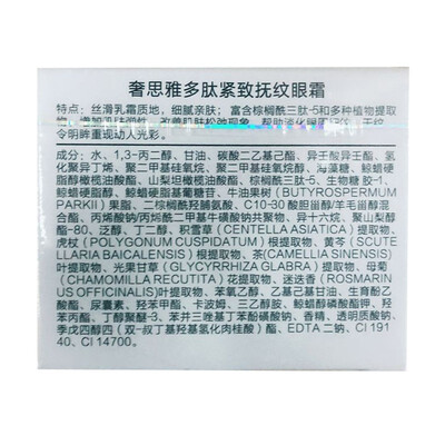 丝滑乳霜质地,水润滋养肌肤。添加牛油果树、积雪草等提取物,能够增加肌肤弹性,改善肌肤松弛现象,紧致眼周肌肤。