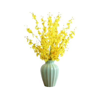 此款选用跳舞兰,纤细的花枝迎风轻舞,如同少女般活泼;明亮的黄色,为居室增添一份温馨浪漫,让您心情更愉悦。