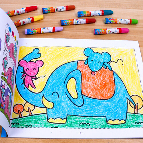 通过浓重的线条勾勒与简洁的绘画指导,为孩子呈现有关人物、动物、食物等多方面的绘画素材,引导孩子学会色彩搭配。