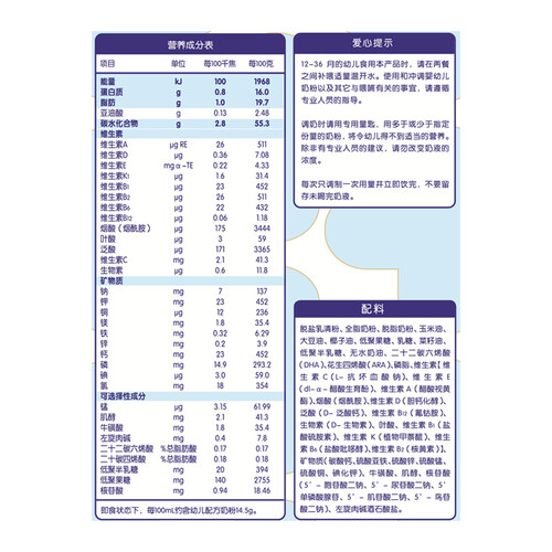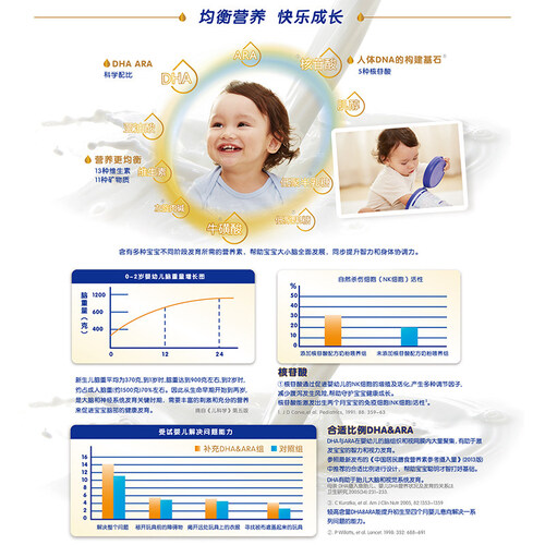 蕴含益生元成分,提升肠胃防御系统功能,保护肠胃时刻舒适顺畅。并添加DHA和ARA营养,帮助大脑和视力发育,拥有健康宝宝。