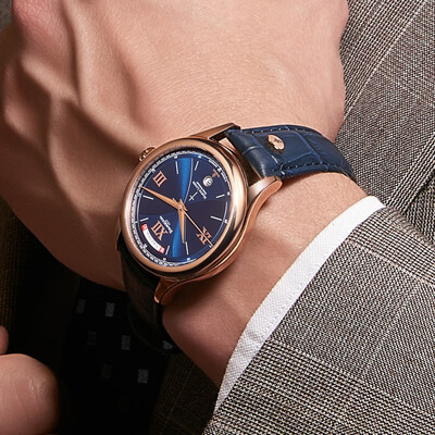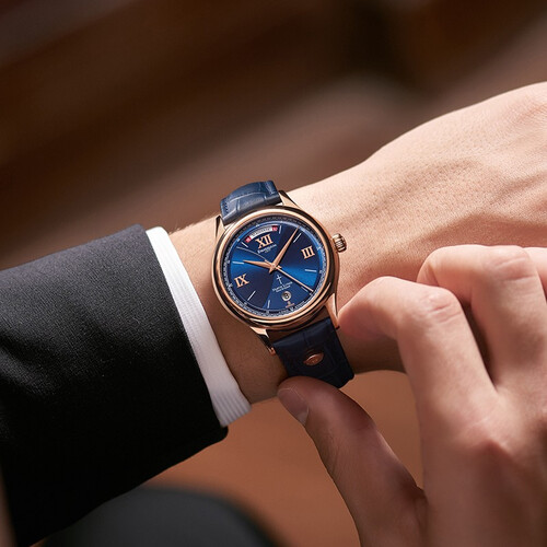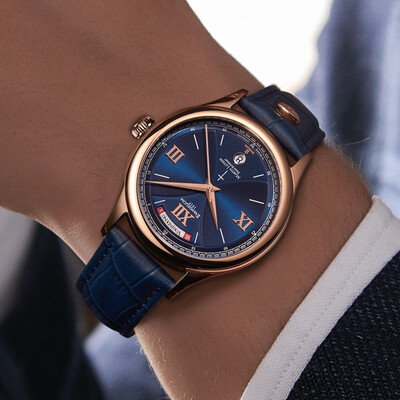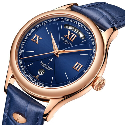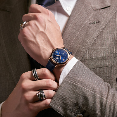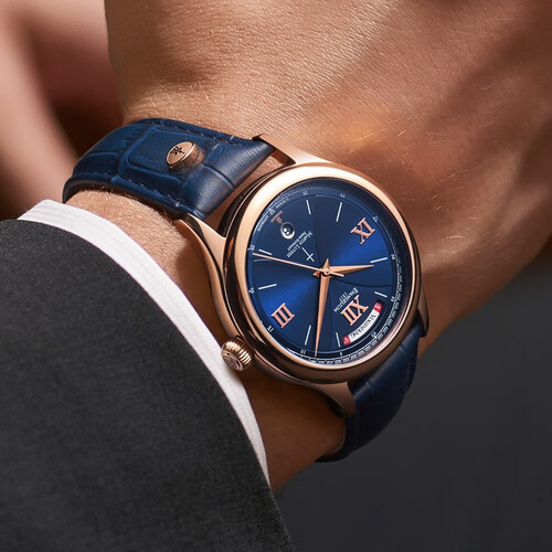 采用高强度精钢表壳,并镀以18k金,增加耐用度的同时,光泽感大幅度提升。全景背透底盖,可以看见红宝石轴承,美观性很强。