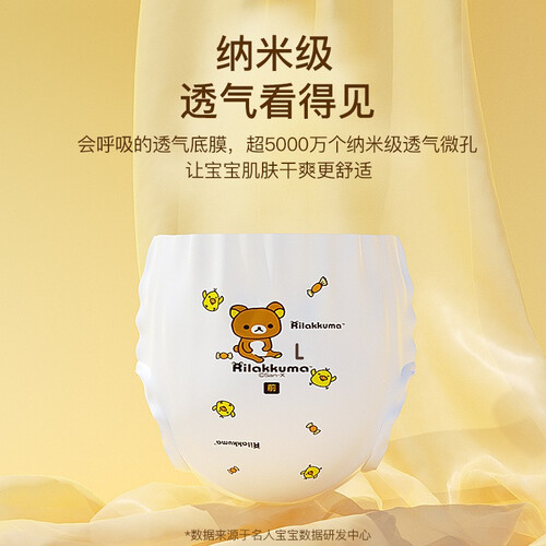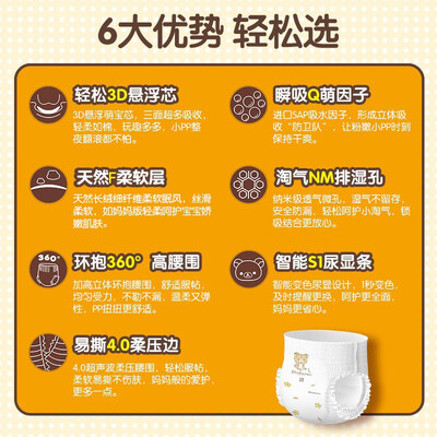 纳米级的透气微孔,避免湿气长时间在拉拉裤中残留。3D立体悬浮芯体,不用担心宝宝会翻滚,减少侧漏风险。