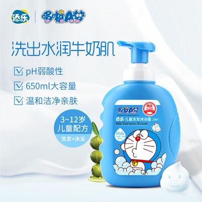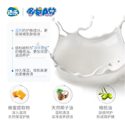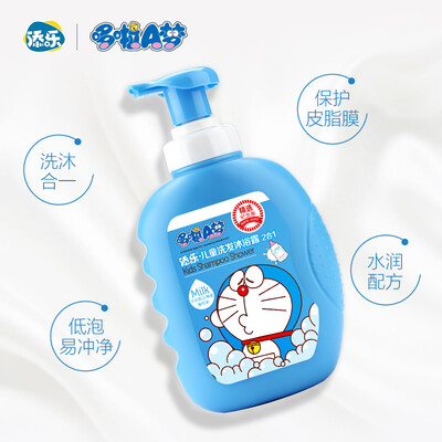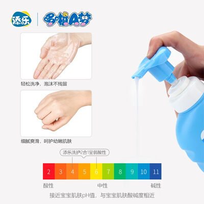 外观印有哆啦A梦图案,彰显萌趣可爱;含有橄榄提取物成分,更好的滋润宝宝皮肤;低泡配方的设计,方便冲洗更加省水。
