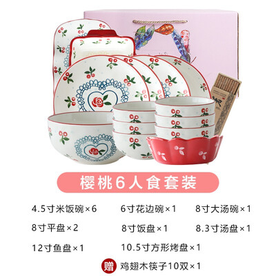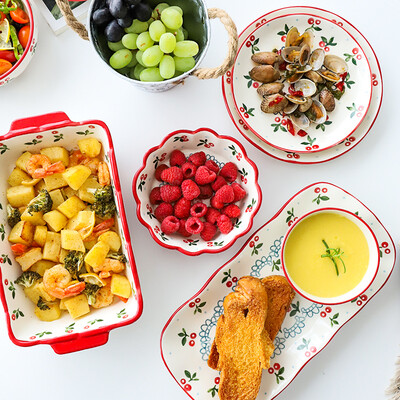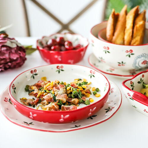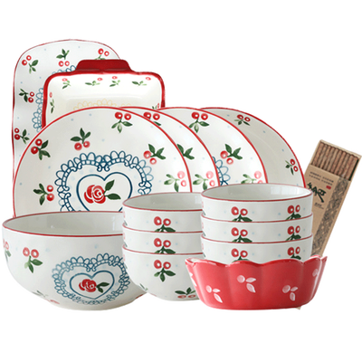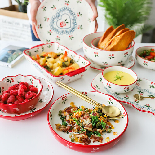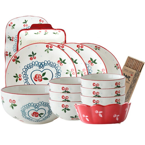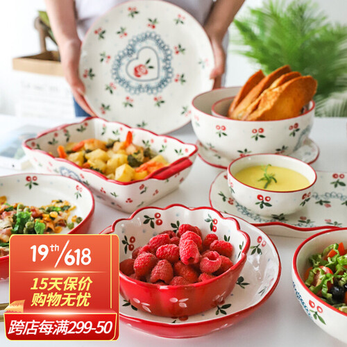 风格复古匠心手绘,自然可爱满足少女心。边缘不规则设计摆盘好看,红色手绘描边,美观有活力。套装配置齐全,满足使用需求。
