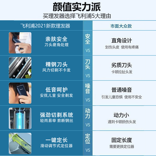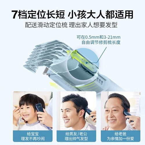飞利浦理发器采用安全陶瓷短齿,柔和贴近头皮,宝宝乱动也不怕,马达静音低噪,不吵不闹,让宝宝配合理发。