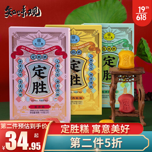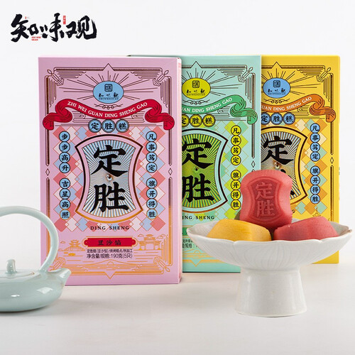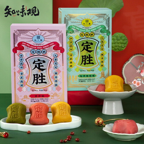 三种口味龙井蛋黄豆沙,每一个都是经典的老字号风味,外皮上刻有定胜,雕刻细节,入口松软酥脆。