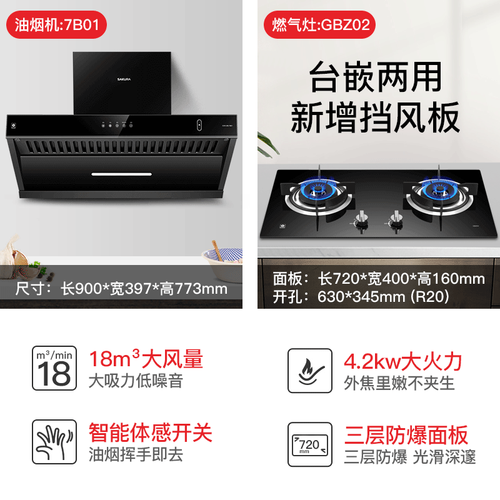烟机采用智能触摸五键开关,拥有体感和延时功能,开关方便。燃气灶拥有4.2KW大火力,可随心调节火力,玩转烹饪。