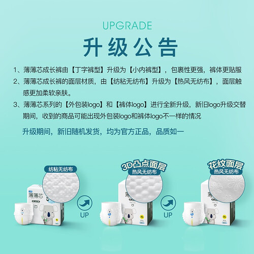 采用新升级轻薄工艺,纤薄透气,让宝宝摆脱闷热和湿感,舒适生活每一天。一体成型全芯体设计,牢牢锁住尿液不下垂,宝宝更轻松。