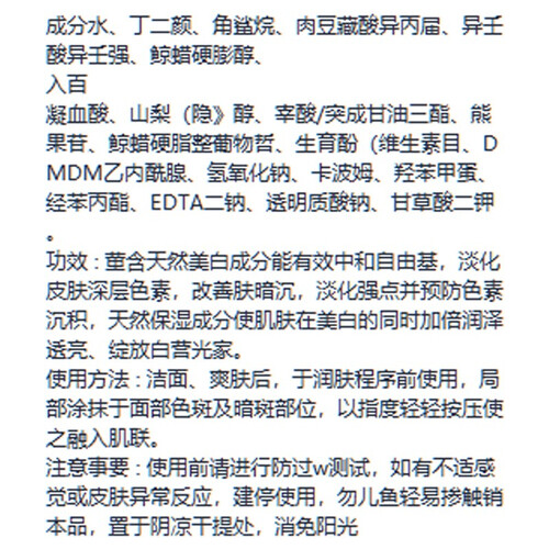 核心成分是牛油果,含有丰富的维生素E,可以有效提亮肤色,减少皮肤色素沉积。清斑后皮肤会变得水润光滑。