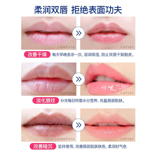 有效淡化唇纹,舒缓和修复唇部肌肤,让唇部保持水润,变得更柔嫩。含有乳木果精华,长时间呵护你稚嫩的唇部。