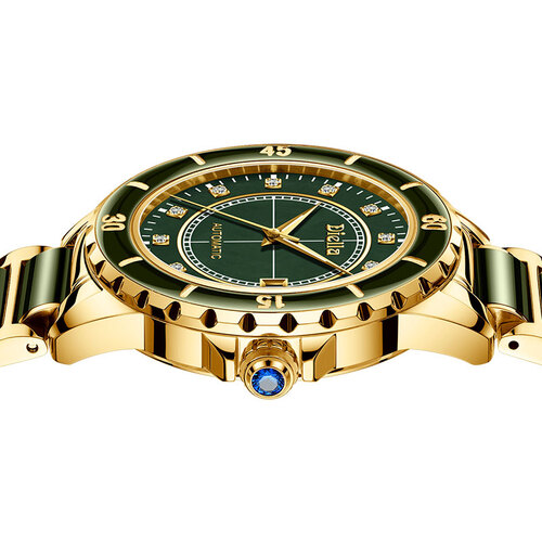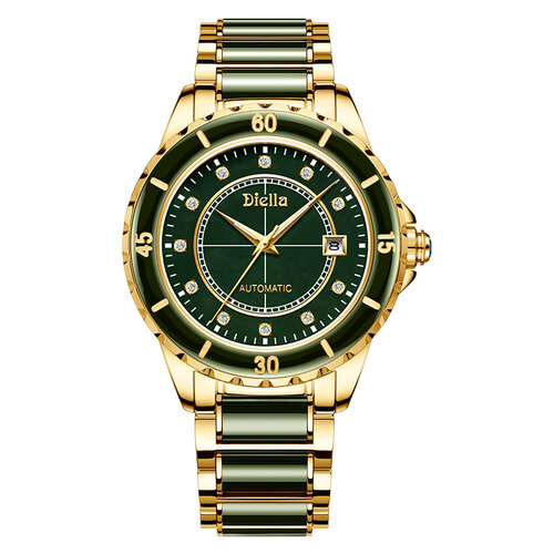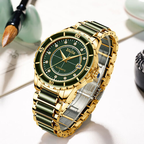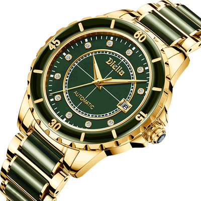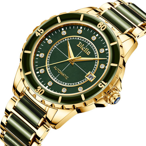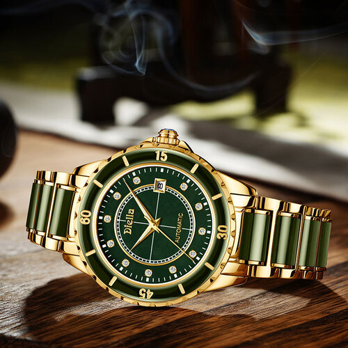 镶嵌翡翠设计,大气又时尚,佩戴彰显您的大气雅致。搭配钻石与小刻度盘,方寸之间,凸显您的从容与优雅。