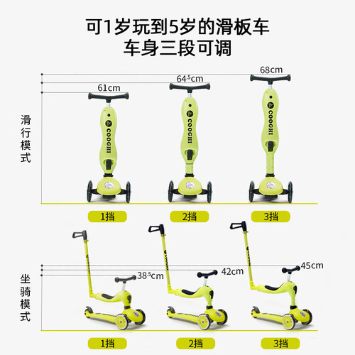 3段可调车身及座垫设计,根据孩子身高随心调节,陪伴孩子一起成长。采用PU静音轮,防滑耐磨,给孩子提供更稳固滑行。