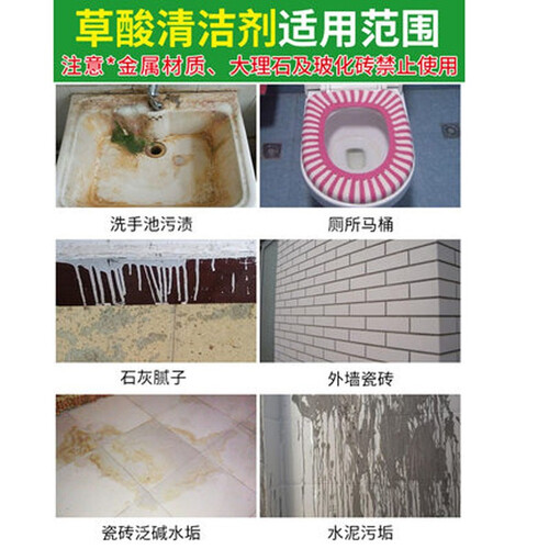 使用高浓度草酸清洁,使用时避免直接接触皮肤表面,请放置在安全位置。具有强效的清洁能力,不伤陶瓷。
