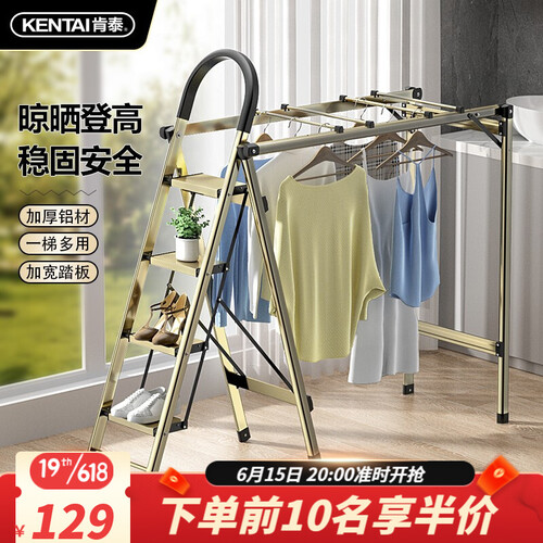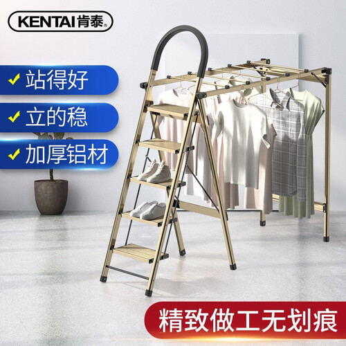 梯子采用了可折叠的结构,折叠和展开都很容易,便于收纳,同时还搭配了晾晒杆,展开后可以晾晒衣服,一物多用。