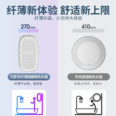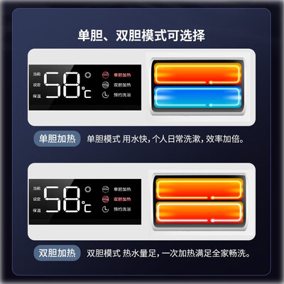 创新双胆设计,提升加热效率,节省等待时间,纤薄的机身设计,释放浴室空间,小浴室也可轻松安装。