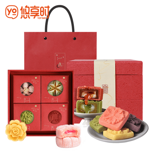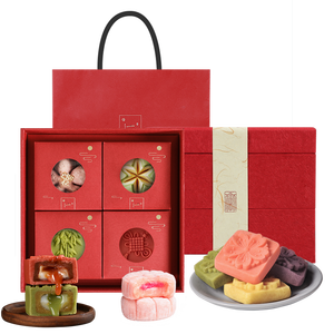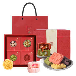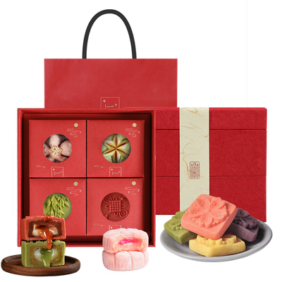 精美的包装盒采用特殊的艺术纸腰封,双层礼盒设计,第一层采用烫金,镂空的红卡纸小盒,第二层采用固定吸塑托,更好的保护食品。