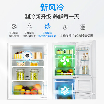 采用新风冷设计,能够时刻守护食材新鲜,防止结霜,搭载智能双变频技术,功耗更低,节能省电。