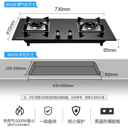 面板采用了钢化玻璃材质,耐高温防爆裂,使用更安心。加厚X型锅架,可兼容各种锅具,支撑稳固,使用不受限制。