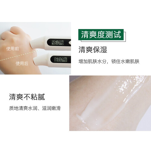 绵柔的乳液质地,易延展吸收更快,肌肤清爽不黏腻,毛孔自由呼吸。深层保湿,补水更滋养,打造弹润水光肌。