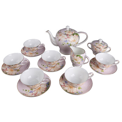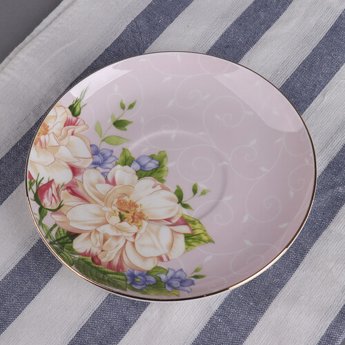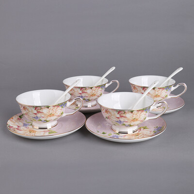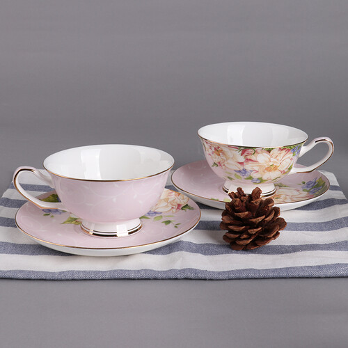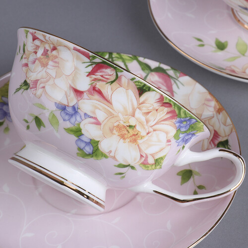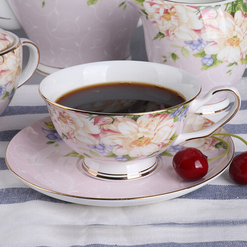 锦凤咖啡杯套装花卉图案绘制精美,和粉红色相搭配更加衬托出花卉的明亮感。金边描绘,显得大气高贵,作为礼物送人也是可以的。