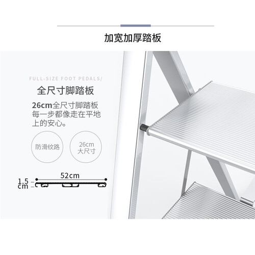 表面采用无铆钉设计,不仅可以登高,还可以置物更加美观,结合大尺寸的踏板,让每一步都像走在平地上舒适安稳。