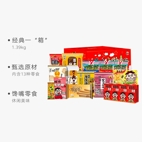 内含果冻、牛奶糖、牛奶等多种零食,品类繁多,满足您的味蕾。1.39kg一箱装,份量充足,吃得过瘾。
