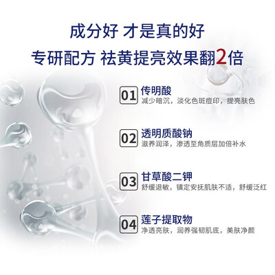 蕴含传明酸成分,能够有效抑制黑色素,重新焕亮肌肤。大小透明质酸钠,及时锁住水分,提升了保湿效果。