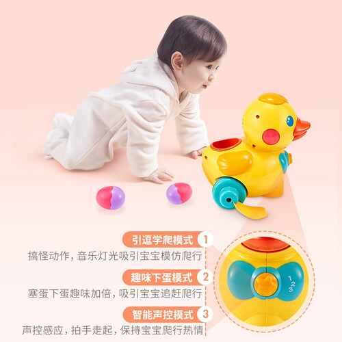 具有三大引逗模式,可以吸引宝宝模仿爬行,增强爬行小乐趣。采用智能声控,只需妈妈轻松拍拍手,鸭子就可以行走,非常方便。