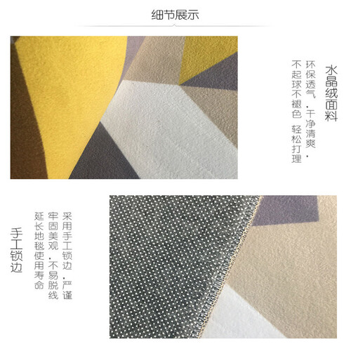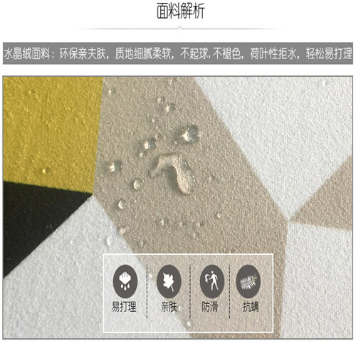 毯面精选水晶绒面料,环保透气,且具有荷叶性拒水功能,打理起来更加方便,轻轻擦拭就能去除污渍。