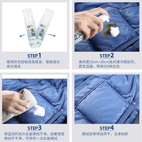 此款为200ml的轻量装设计,方便携带,避免户外无法清洗的尴尬;适用于羽绒服、布艺沙发等,用途广泛,清洁不费力。